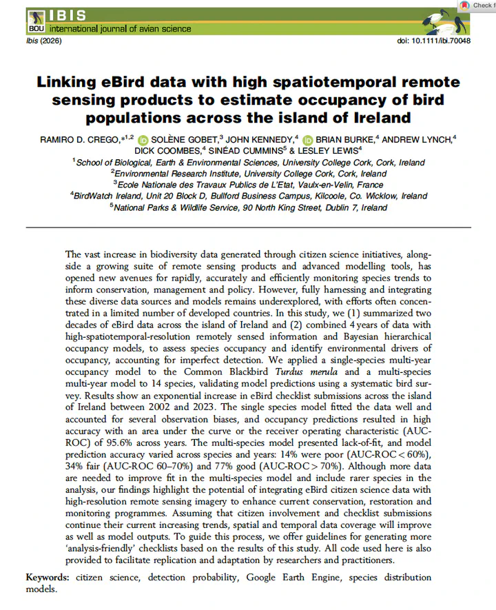 Linking eBird data with high spatiotemporal remote sensing products to estimate occupancy of bird populations across the island of Ireland 2026-Mar-09· Ramiro D Crego , Gobete S, , Kennedy, J , Burke, B , Lynch, A , Coombes, D , Cummins, S , Lewis, L · 0 min read PDF Cite Code DOI Last updated on 2026-Mar-09 Bird Authors Ramiro D Crego Lecturer in Zoology/Animal Ecology ← Ontogeny and individuality in flight trajectories of a soaring specialist 2026-Mar-14 Validating habitat suitability assessments with post-translocation animal movement data 2025-Nov-01 →